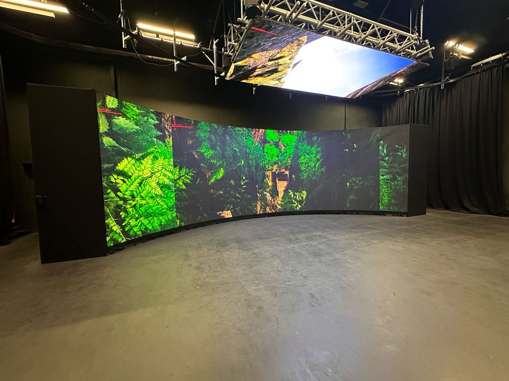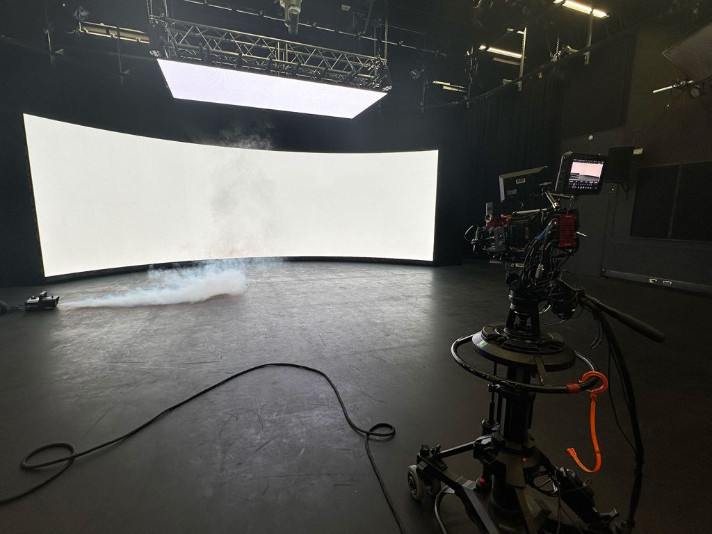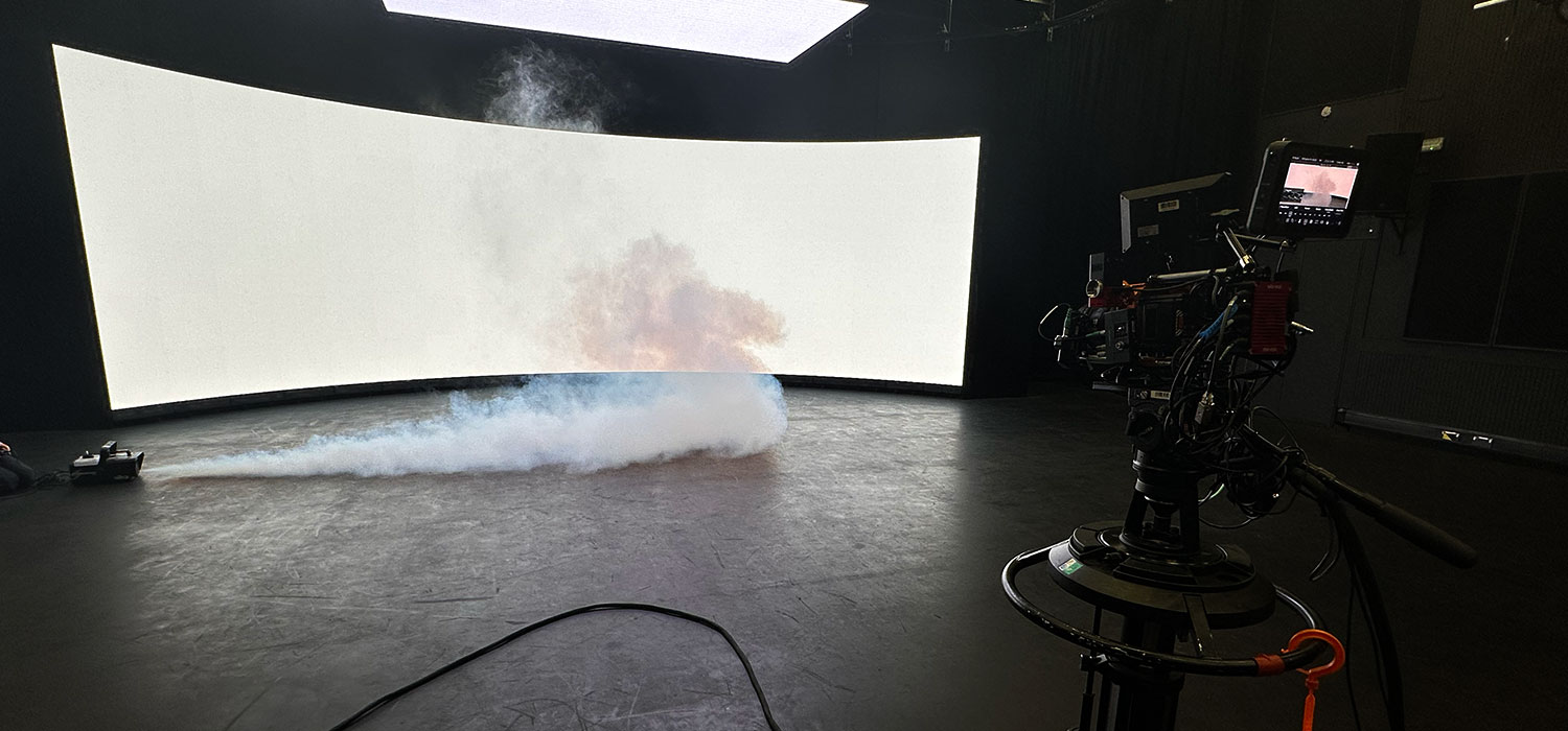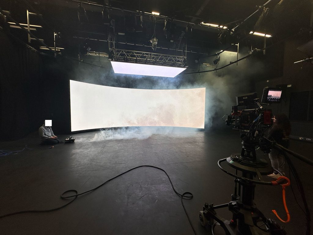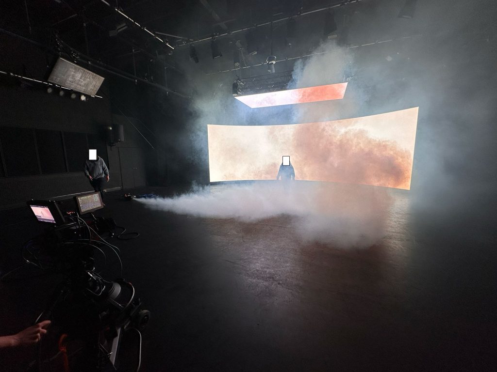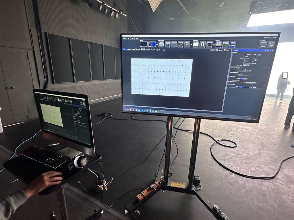 Setup of a white screen in the stage settings and setup of the smoke machine.