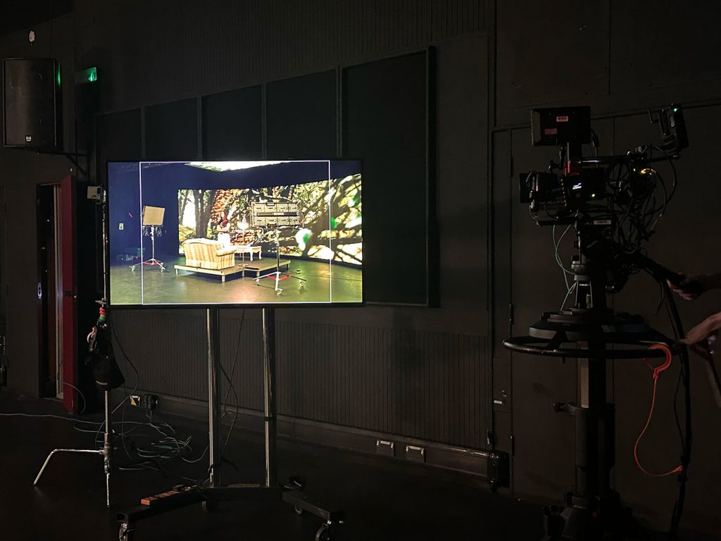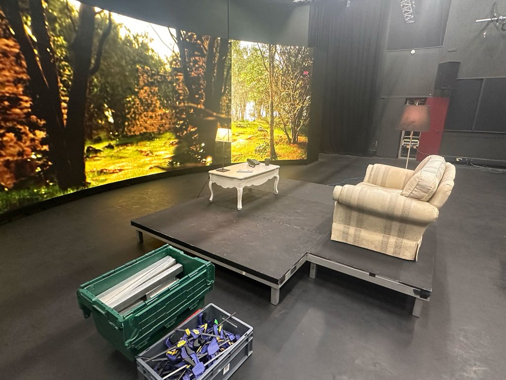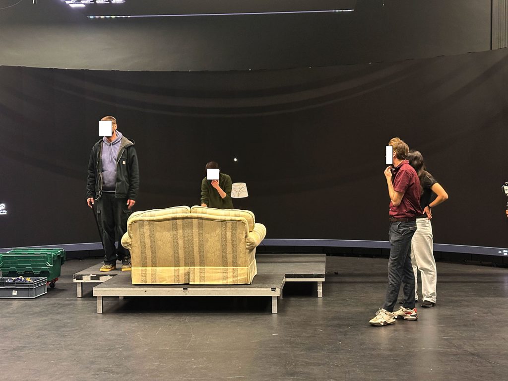 The environment build was handled byanother member of the team based on their vision. Planning was made to assist with the stage construction and staging of the sofa setup in front of the stage based on storyboards provided. We gave assistance in carrying props and setup.